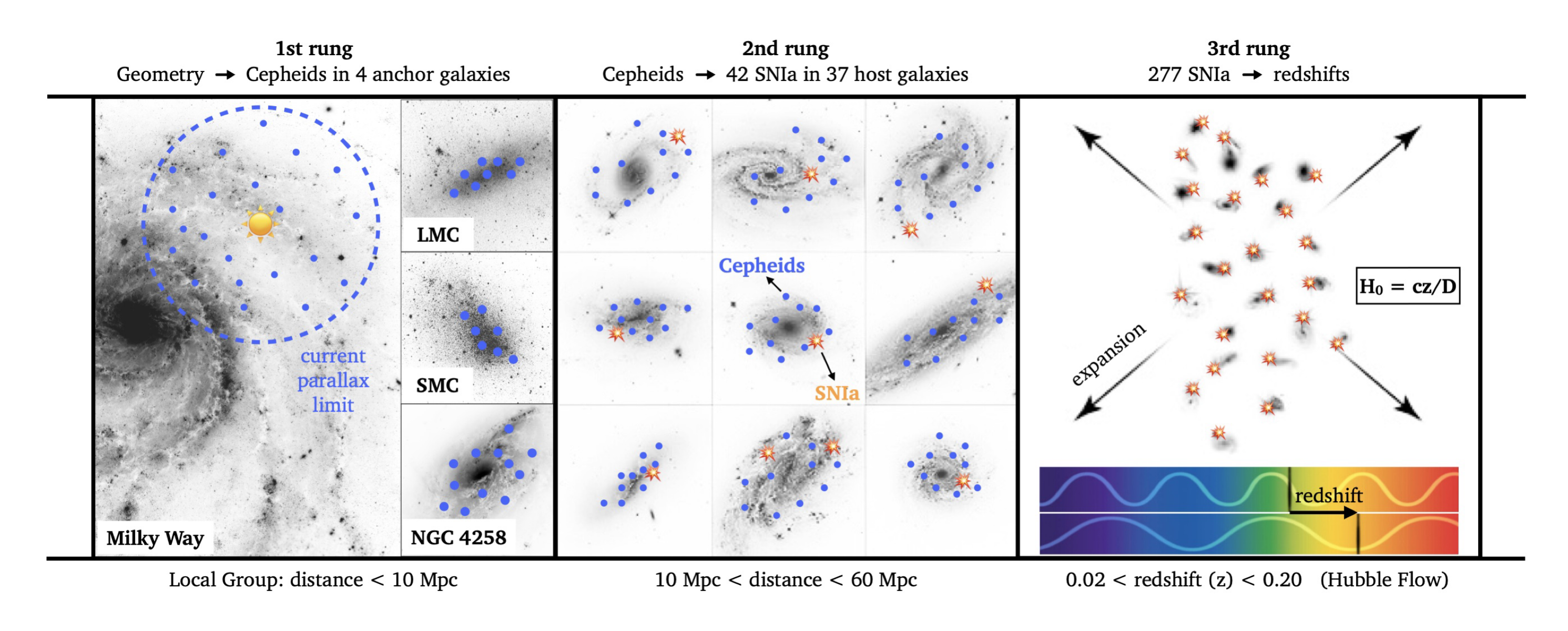 My research focuses on astronomical distance measurements using Cepheid variables, with the goal of a 1% determination of the Hubble constant (H0). The current tension between the local measurement of H0 in the nearby universe (H0 = 73.5 ± 0.8 km/s/Mpc) and its value inferred from the Λ-CDM model calibrated with CMB data in the early universe (H0 = 67.4 ± 0.5 km/s/Mpc) has reached a 7σ significance. This intriguing discrepancy, which has been recently confirmed with JWST observations of Cepheids, provides growing hints of new physics beyond Λ-CDM.